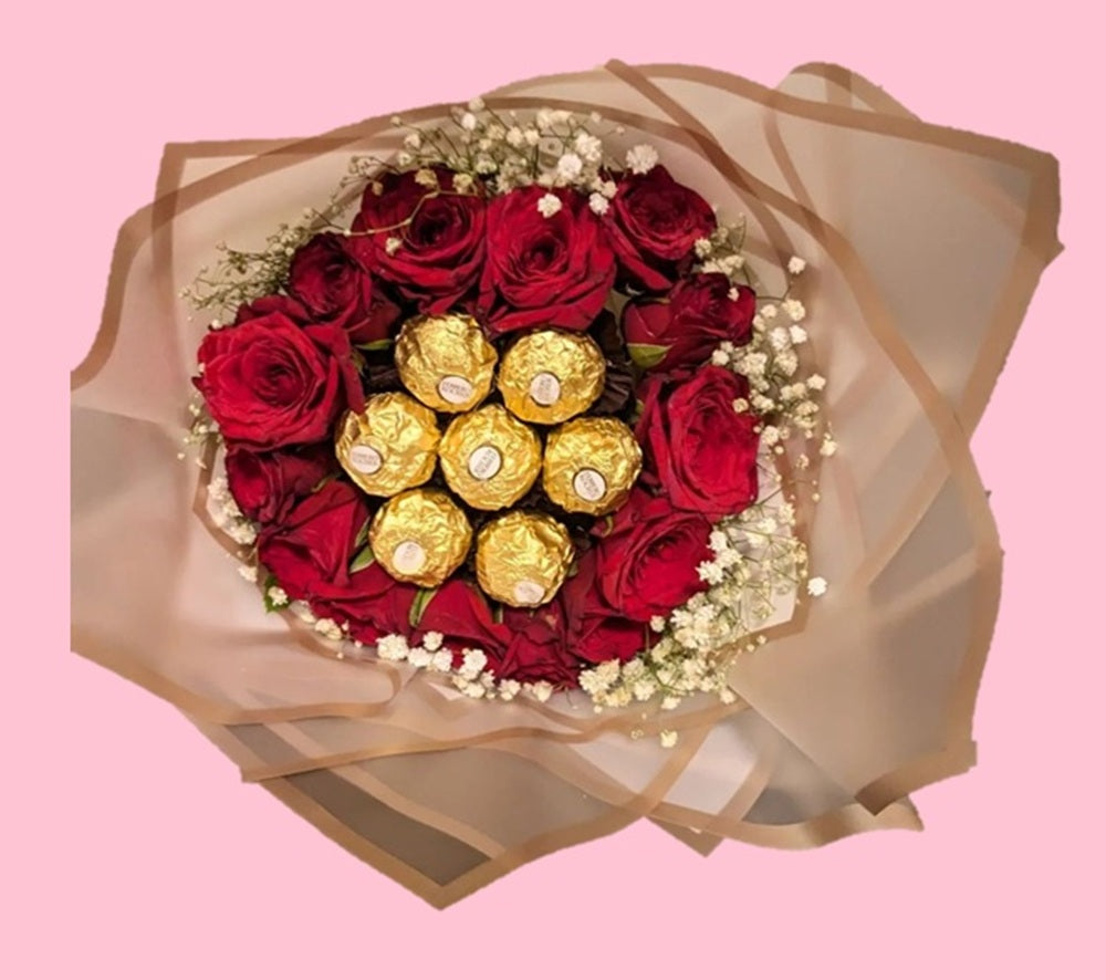Premium Chocolate & Flower.A luxury mixed gift bouquet that combines flowers and chocolates for a rich, elegant, and romantic presentation.