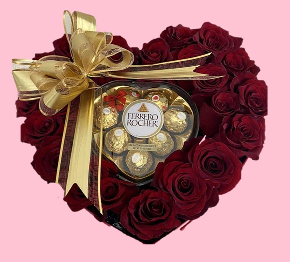 Heart-Shaped Red Rose & Ferrero Rocher.A luxury heart-shaped flower and chocolate arrangement with a very romantic and premium look.